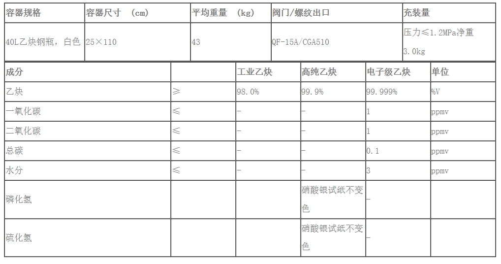 簡要(yào)描述:産品名稱:乙炔|高(gāo)純乙炔其他(tā)名稱:切割氣|電(diàn)石氣分(fēn)子(zǐ)式:C2H2U↕N NO:UN 1001CAS NO:74-86-2産品純度:99.9~99.999%包裝說(shuō)明(míng):乙炔專用(yòng≥)鋼瓶...